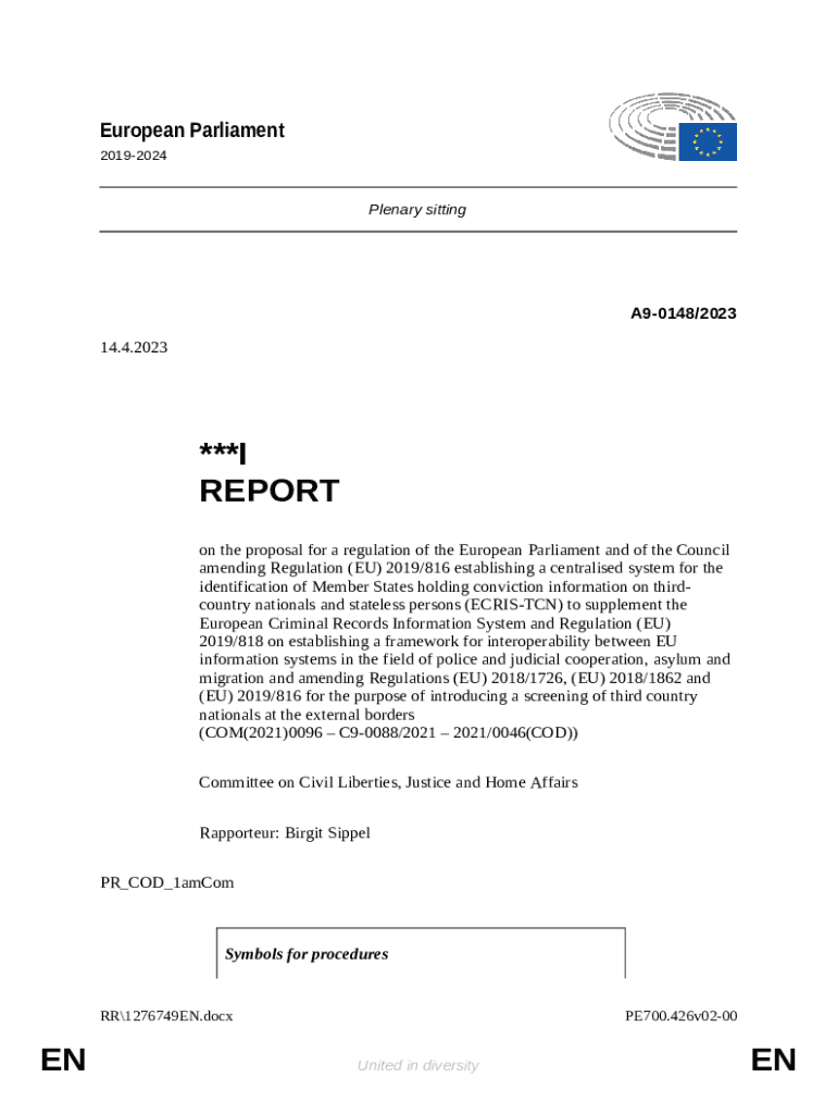 The on the proposal for a regulation of the European Parliament and of the Council amending Regulation (EU) 2019/816 establishing a centralised system for the identification of Member States holding conviction ination on third-country nationals and s is a Word document needed to be submitted to the relevant address to provide some info. It must be filled-out and signed, which may be done manually, or via a certain software such as PDFfiller. It helps to fill out any PDF or Word document directly in your browser, customize it according to your purposes and put a legally-binding e-signature. Right after completion, user can send the on the proposal for a regulation of the European Parliament and of the Council amending Regulation (EU) 2019/816 establishing a centralised system for the identification of Member States holding conviction ination on third-country nationals and s to the relevant individual, or multiple recipients via email or fax. The template is printable too because of PDFfiller feature and options presented for printing out adjustment. Both in digital and physical appearance, your form should have a organized and professional look. It's also possible to save it as the template to use later, without creating a new blank form over and over. Just customize the ready document.