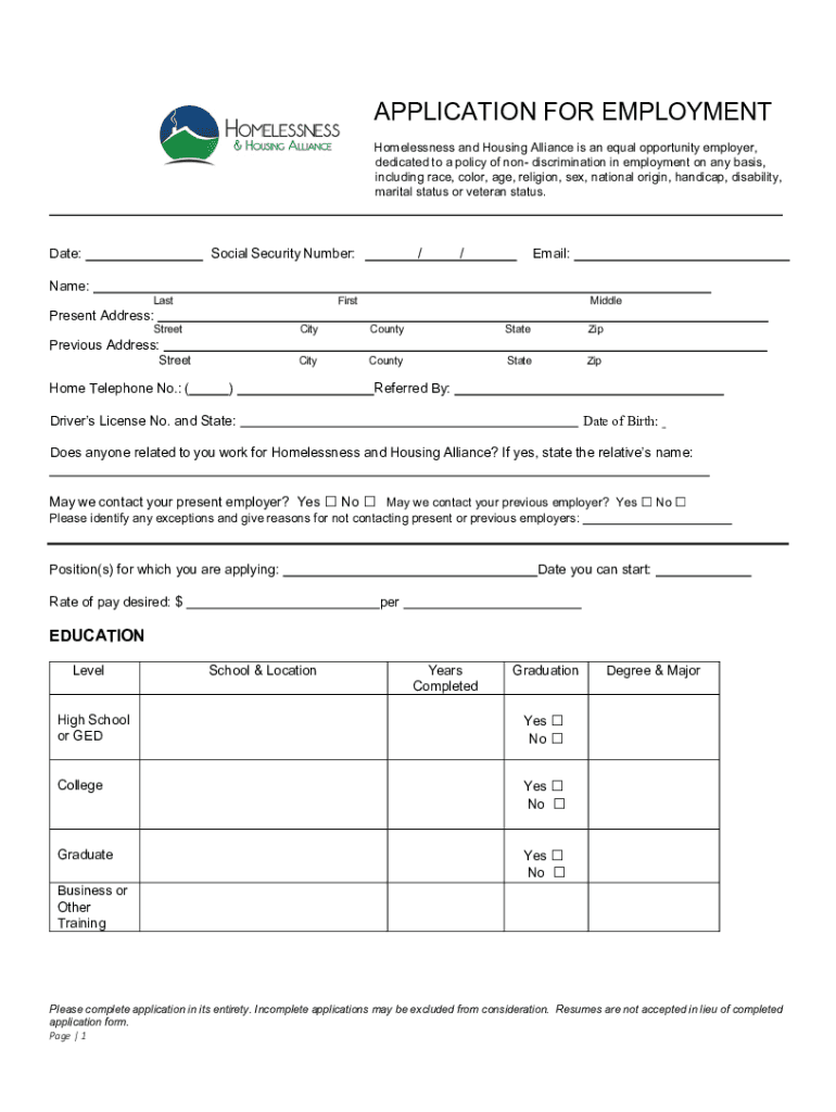 APPLICATION FOR EMPLOYMENT Homelessness and Housing Alliance is an equal opportunity employer, dedicated to a policy of non discrimination in employment on any basis, including race, color, age, religion,