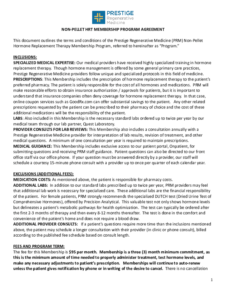 NONPELLET HRT MEMBERSHIP PROGRAM AGREEMENT This document outlines the terms and conditions of the Prestige Regenerative Medicine (PRM) NonPellet Hormone Replacement Therapy Membership Program, referred