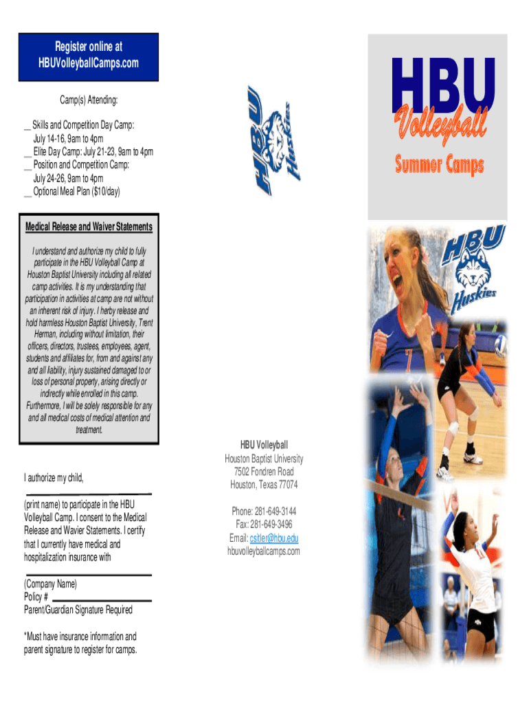 HBU VolleyballRegister online at HBUVolleyballCamps.com Camp(s) Attending: __ Skills and Competition Day Camp:July 1416, 9am to 4pm __ Elite Day Camp: July 2123, 9am to 4pm __ Position and Competition
