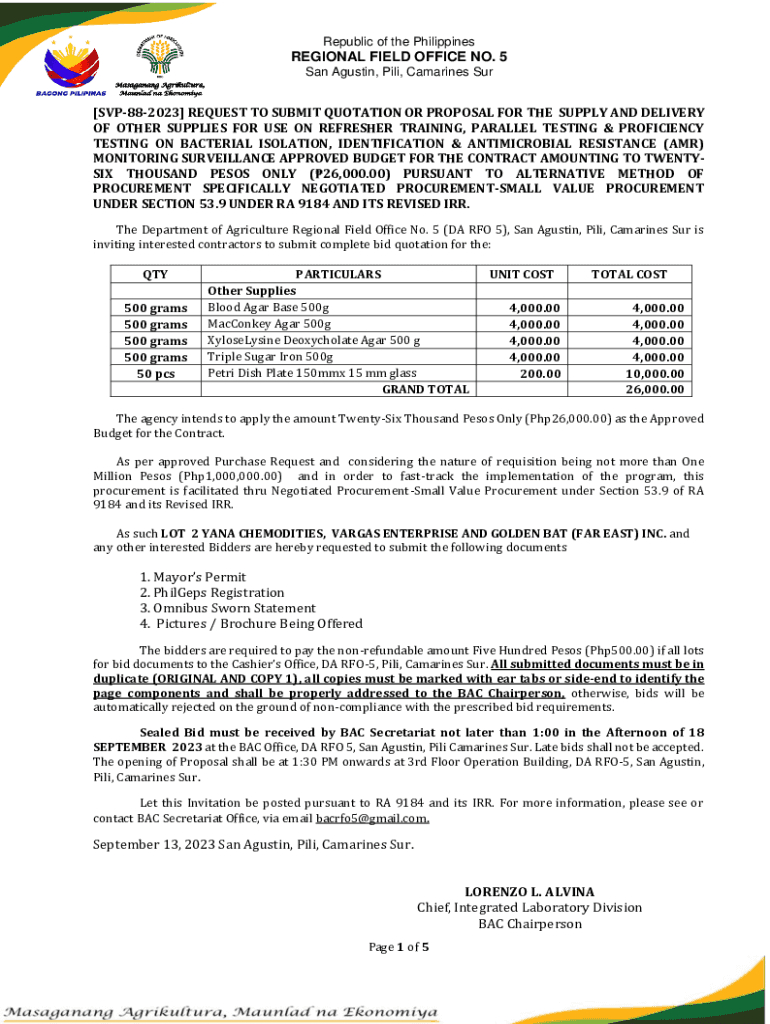 Republic of the PhilippinesREGIONAL FIELD OFFICE NO. 5 San Agustin, Pili, Camarines Sur[SVP882023] REQUEST TO SUBMIT QUOTATION OR PROPOSAL FOR THE SUPPLY AND DELIVERY OF OTHER SUPPLIES FOR USE ON