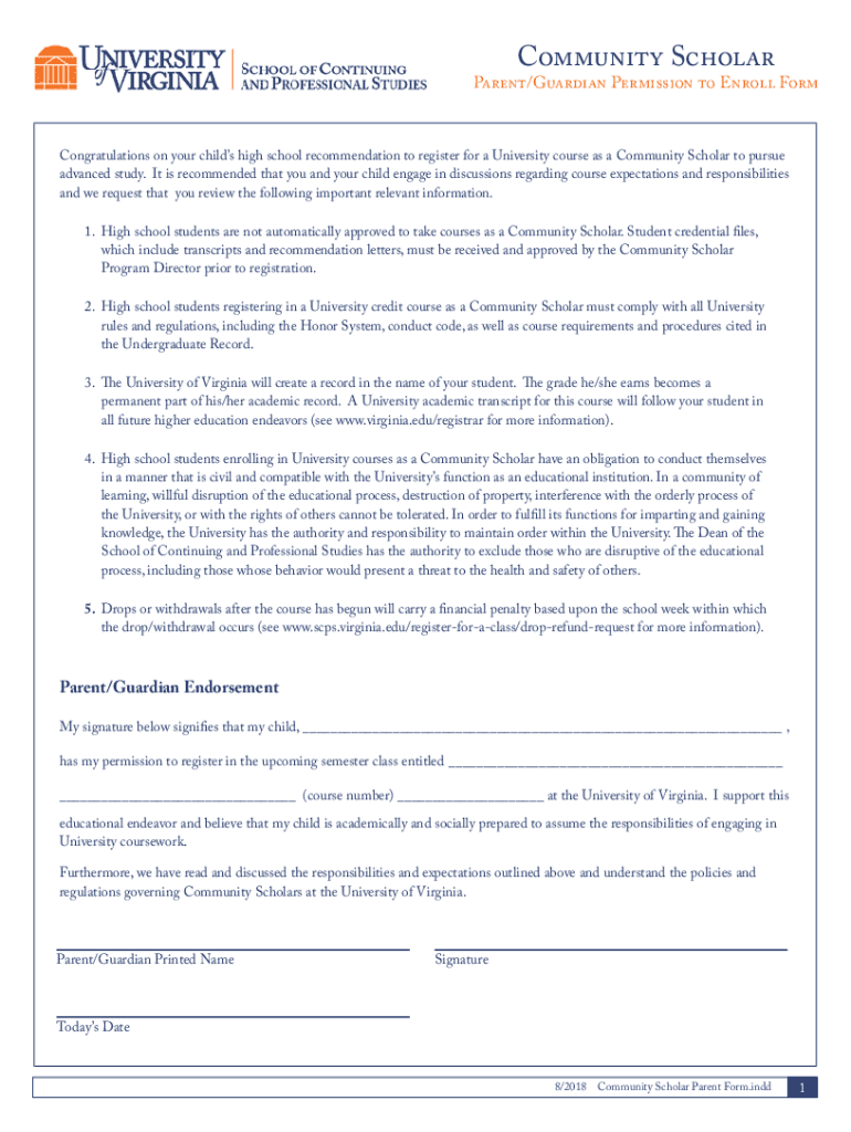 Community ScholarParent/Guardian Permission to Enroll FormCongratulations on your children high school recommendation to register for a University course as a Community Scholar to pursue