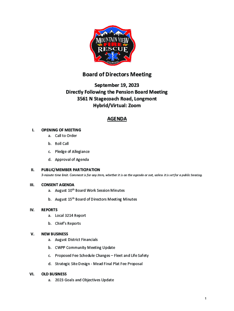 Board of Directors Meeting September 19, 2023, Directly Following the Pension Board Meeting 3561 N Stagecoach Road, Longmont Hybrid/Virtual: Zoom AGENDA I.OPENING OF MEETING a. Call to Order b. Roll