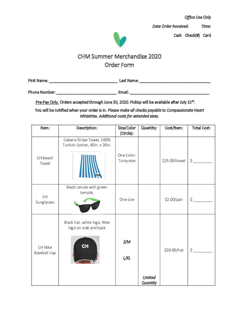 Office Use Only Date Order Received:Time:Cash Check(#) Card CHM Summer Merchandise 2020 Order Form First Name: ___ Last Name: ___ Phone Number: ___ Email: ___ Prepay Only. Orders accepted through