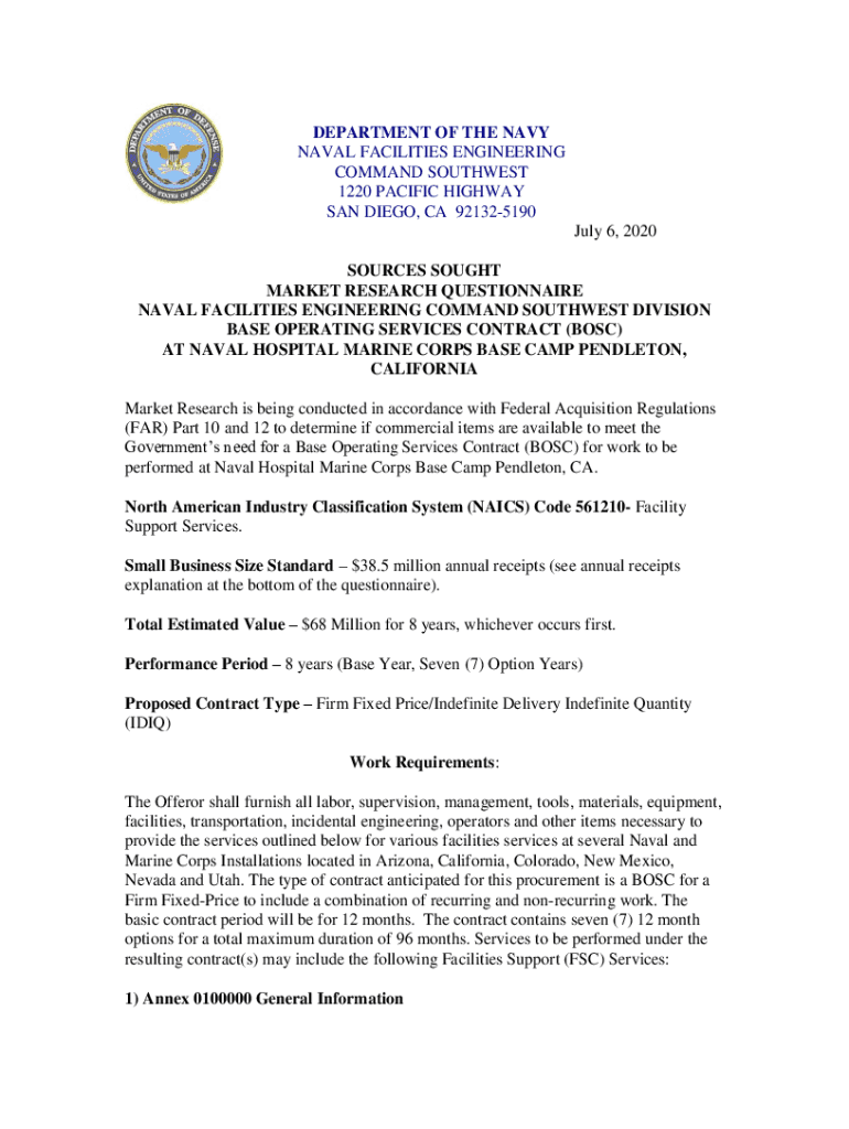 DEPARTMENT OF THE NAVY NAVAL FACILITIES ENGINEERING COMMAND SOUTHWEST 1220 PACIFIC HIGHWAY SAN DIEGO, CA 921325190 July 6, 2020 SOURCES SOUGHT MARKET RESEARCH QUESTIONNAIRE NAVAL FACILITIES ENGINEERING
