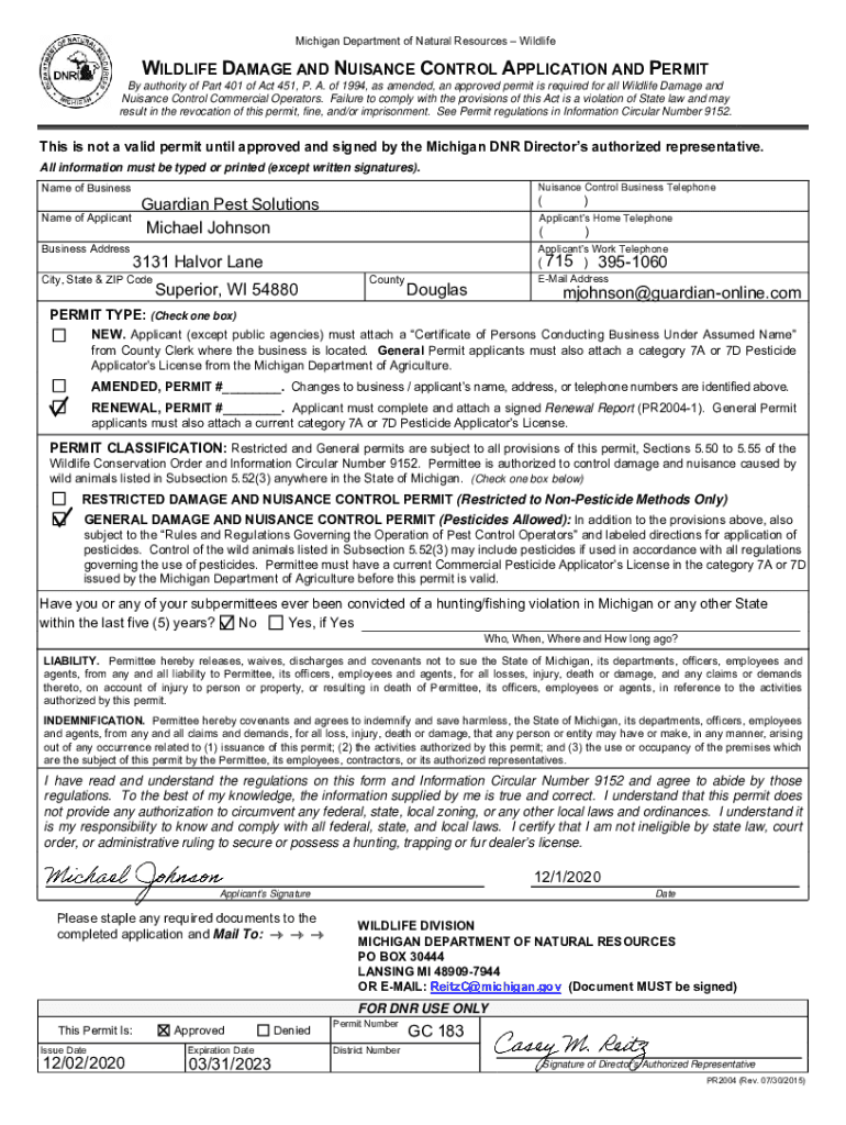 Michigan Department of Natural Resources WildlifeWILDLIFE DAMAGE AND NUISANCE CONTROL APPLICATION AND PERMIT By authority of Part 401 of Act 451, P. A. of 1994, as amended, an approved permit is required