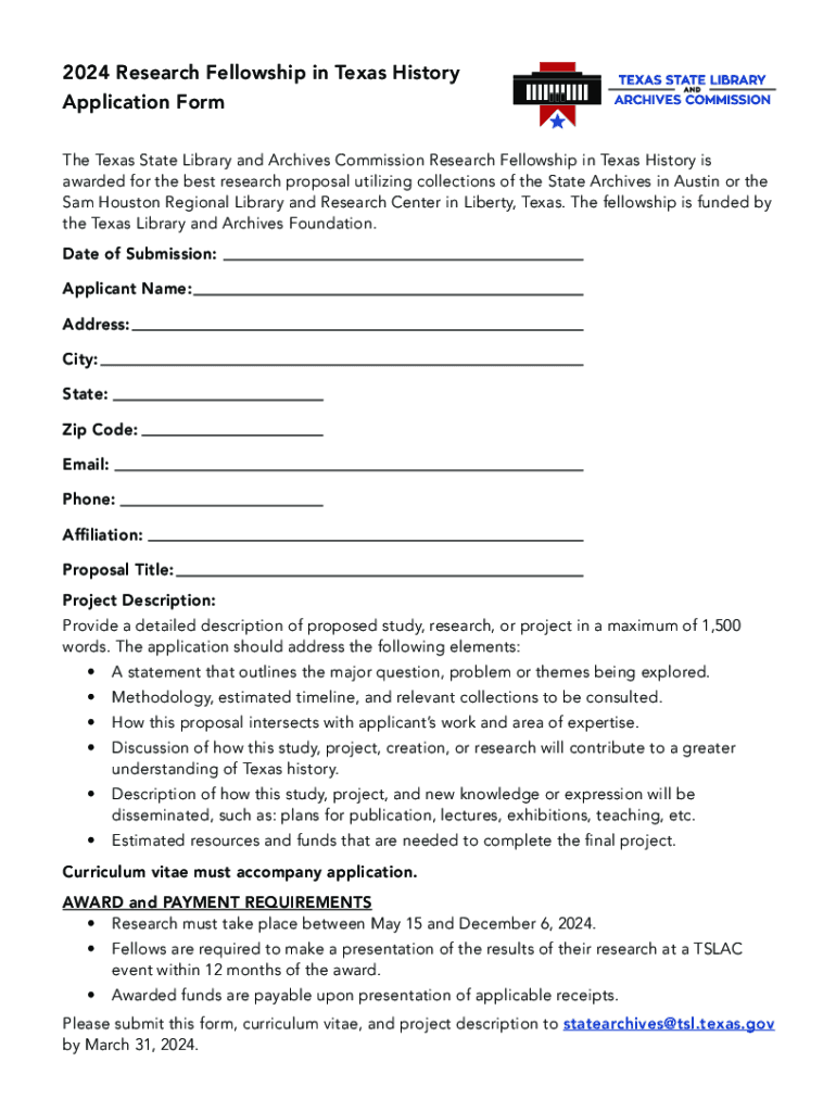 2024 Research Fellowship in Texas History Application Form The Texas State Library and Archives Commission Research Fellowship in Texas History is awarded for the best research proposal utilizing
