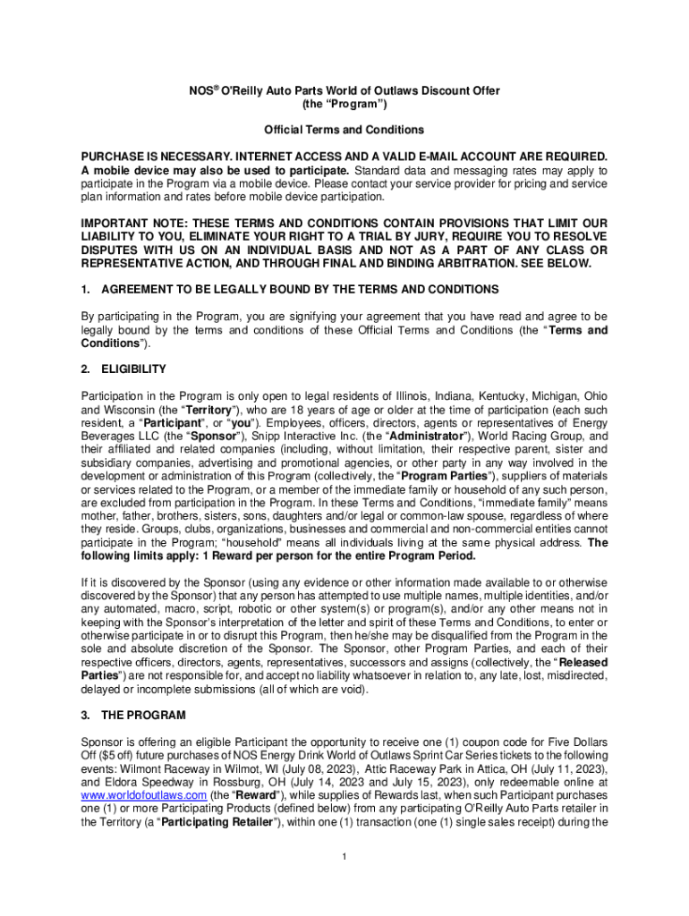 NOS O\'Reilly Auto Parts World of Outlaws Discount Offer (the Program) Official Terms and Conditions PURCHASE IS NECESSARY. INTERNET ACCESS AND A VALID EMAIL ACCOUNT ARE REQUIRED. A mobile device