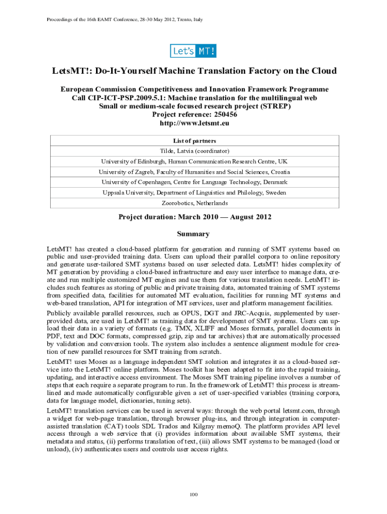 Proceedings of the 16th EAMT Conference, 2830 May 2012, Trento, ItalyLetsMT!: DoItYourself Machine Translation Factory on the Cloud European Commission Competitiveness and Innovation Framework Programme