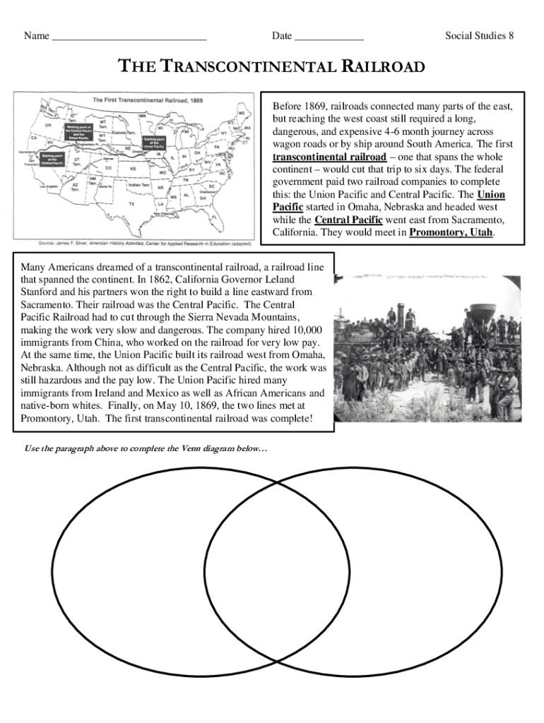 Name ___Date ___Social Studies 8THE TRANSCONTINENTAL RAILROAD Before 1869, railroads connected many parts of the east, but reaching the west coast still required a long, dangerous, and expensive 46