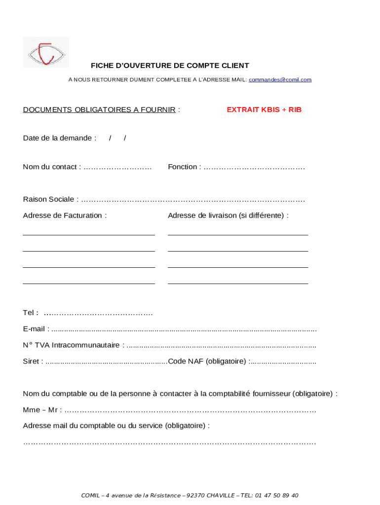 Le formulaire d'ouverture de compte client est un document essentiel pour toutes entreprises désireuses d'ouvrir un compte commercial avec COMIL. Ce formulaire sert à recueillir des informations cruciales, telles que les détails de contact, l'adresse de facturation et le numéro de TVA. En définissant clairement les objectifs de l'ouverture d'un compte, les entreprises peuvent bénéficier d'une procédure simplifiée et professionnelle.
