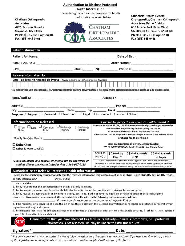 Authorization to Disclose Protected Health InformationChatham Orthopaedic Associates 4425 Paulsen Street Savannah, GA 31405 Ph (912) 3556615 option #8 Fax (855) 6450468The undersigned authorizes to