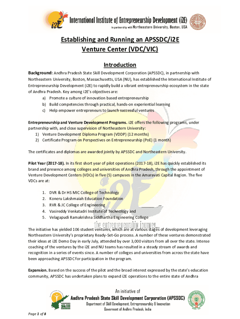 Establishing and Running an APSSDC/i2E Venture Center (VDC/VIC) Introduction Background: Andhra Pradesh State Skill Development Corporation (APSSDC), in partnership with Northeastern University, Boston,