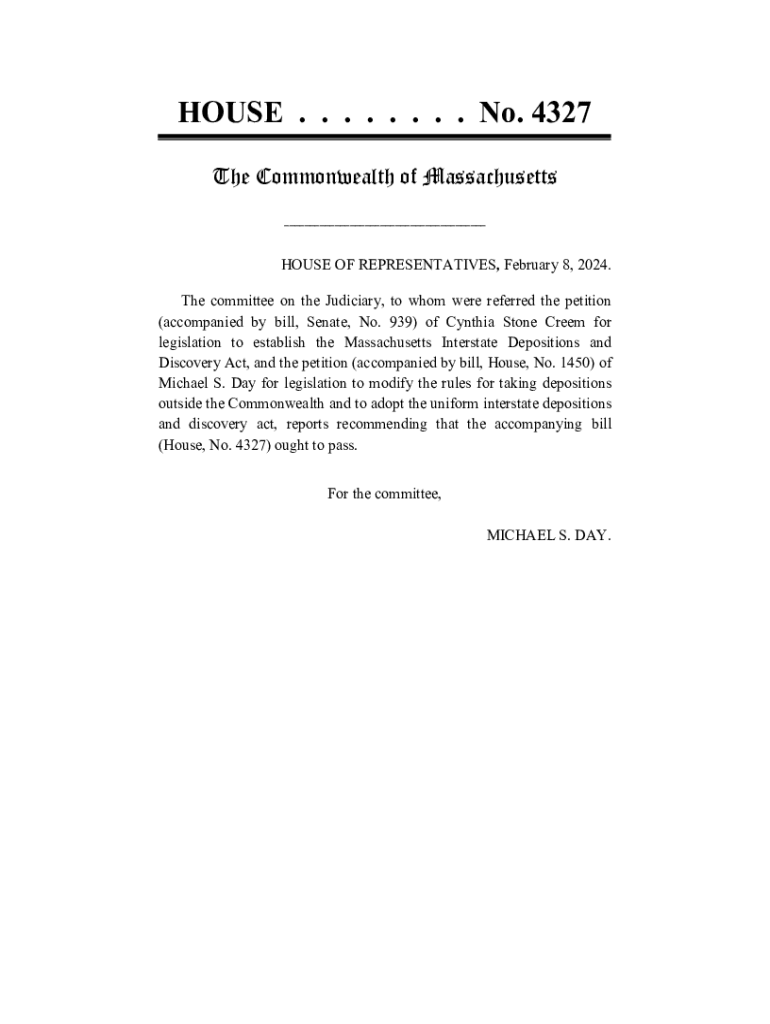 HOUSE . . . . . . . . No. 4327 The Commonwealth of Massachusetts ___HOUSE OF REPRESENTATIVES, February 8, 2024. The committee on the Judiciary, to whom were referred the petition (accompanied by bill,