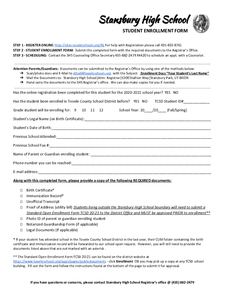 Stansbury High School STUDENT ENROLLMENT FORM STEP 1 REGISTER ONLINE: http://sites.tooeleschools.org/RL For help with Registration please call 4358338761 STEP 2 STUDENT ENROLLMENT FORM: Submit this