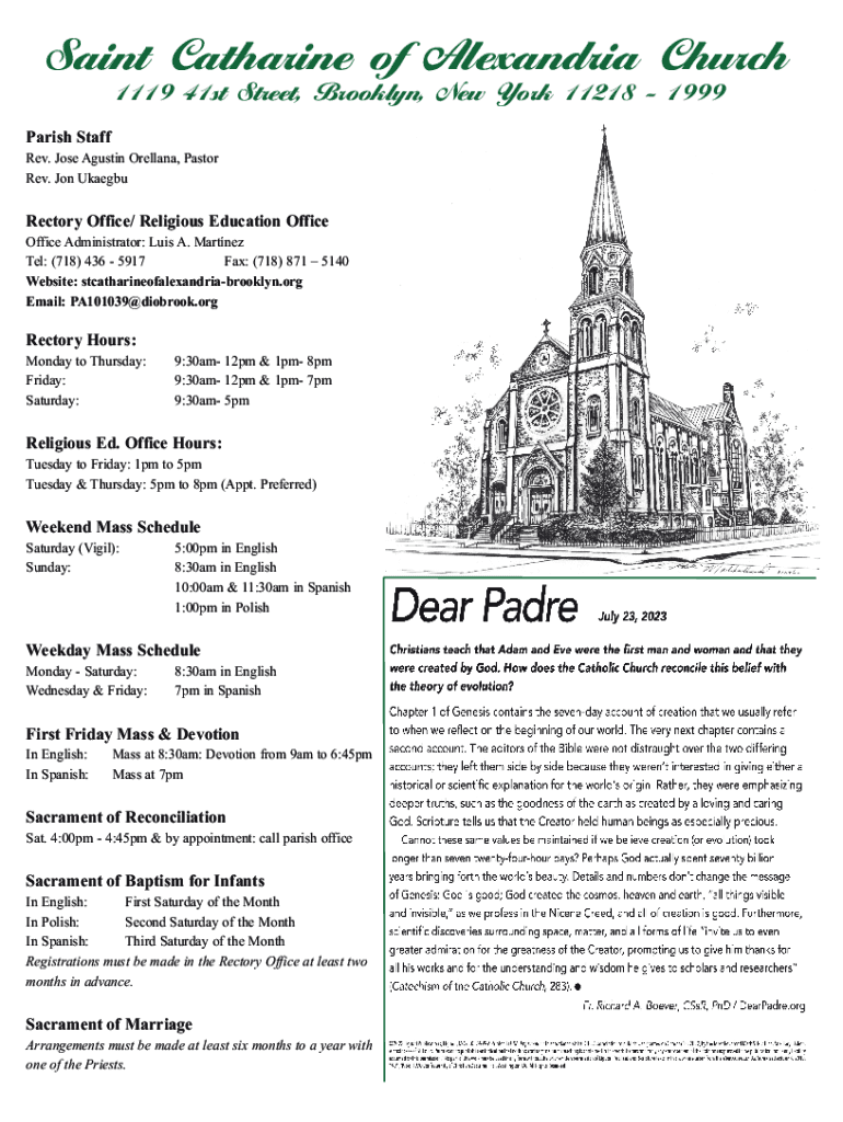 Saint Catherine of Alexandria Churchyards Staff1119 41st Street, Brooklyn, New York 11218 1999Rev. Jose Agustin Orellana, Pastor Rev. Jon UkaegbuRectory Office/ Religious Education OfficeOffice Administrator: