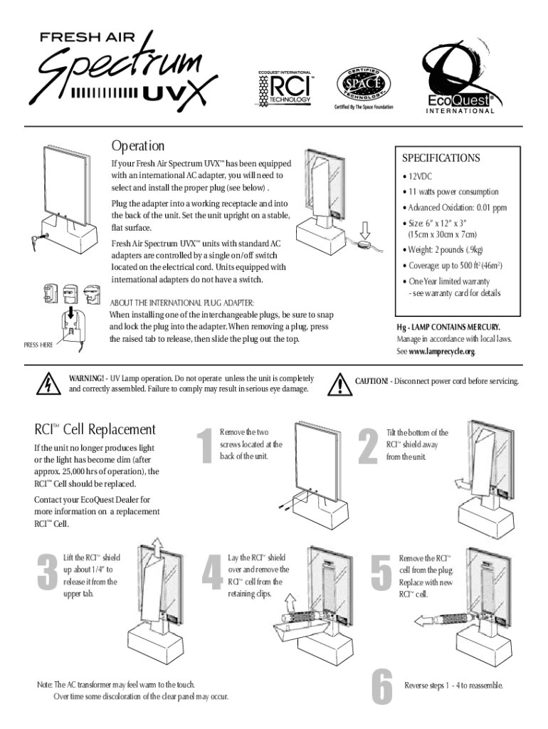 OperationSPECIFICATIONSIfyourFreshAirSpectrumUVXhasbeenequipped withaninternationalACadapter,youwillneedto selectandinstalltheproperplug(seebelow). 12VDC 11 watts power consumptionPlugtheadapterintoaworkingreceptacleandinto