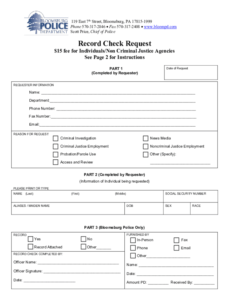 119 East 7th Street, Bloomsburg, PA 178151999 Phone 5703172846 Fax 5703172408 www.bloompd.com Scott Price, Chief of PoliceRecord Check Request$15 fee for Individuals/Non Criminal Justice Agencies