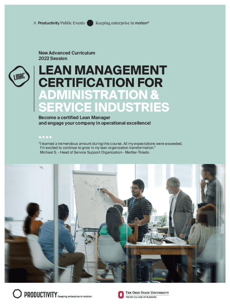 Productivity Public EventsKeeping enterprise in motionNew Advanced Curriculum 2022 SessionLEAN MANAGEMENT CERTIFICATION FOR ADMINISTRATION & SERVICE INDUSTRIES Become a certified Lean Manager and