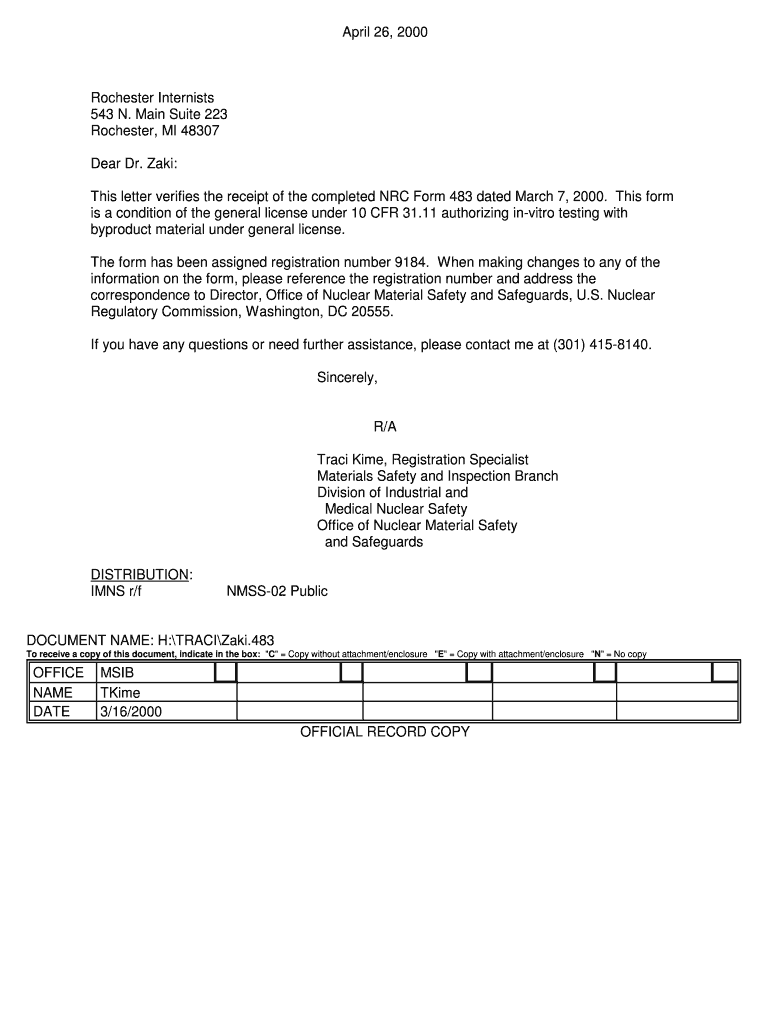 April 26, 2000, Rochester Internists 543 N. Main Suite 223 Rochester, MI 48307 Dear Dr. Saki: This letter verifies the receipt of the completed NRC Form 483 dated March 7, 2000. This form is a condition