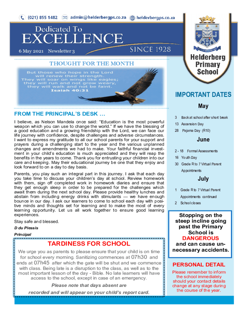 6 May 2021 Newsletter 3THOUGHT FOR THE MONTH IMPORTANT DATES May FROM THE PRINCIPALS DESK I believe, as Nelson Mandela once said: Education is the most powerful weapon which you can use to change