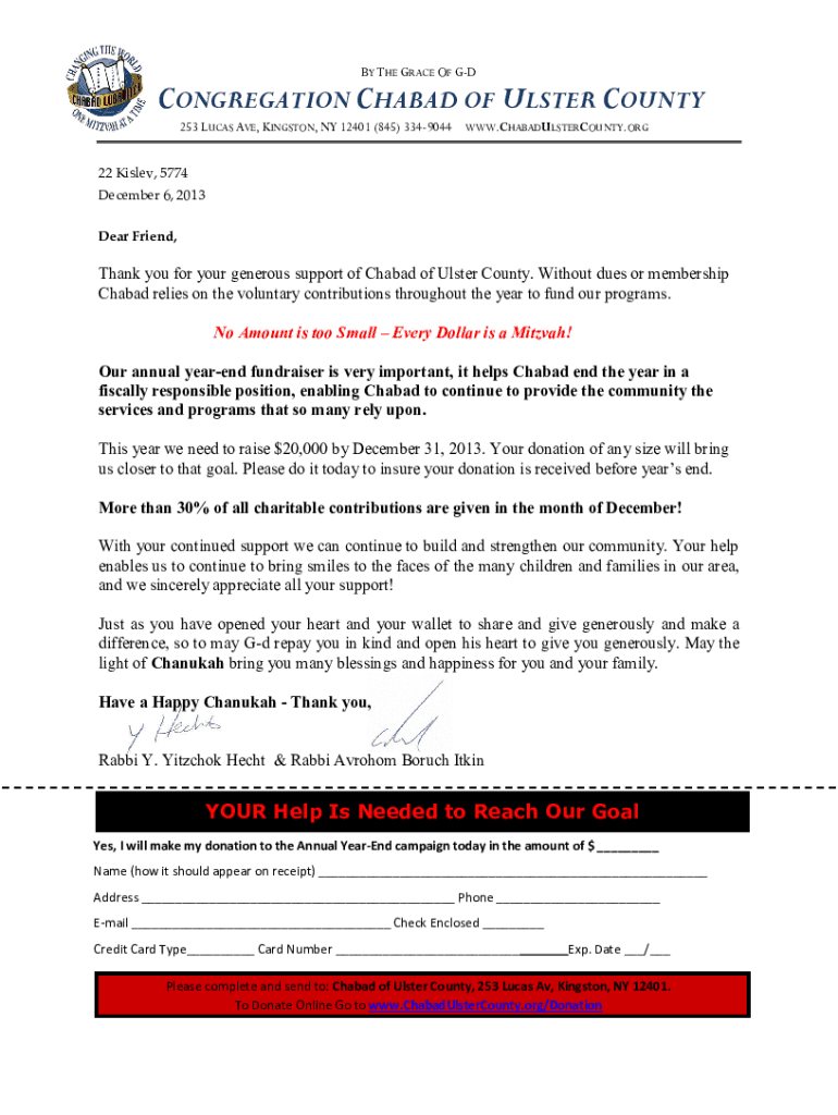 BY THE GRACE OF GDCONGREGATION CHABAD OF ULSTER COUNTY 253 LUCAS AVE, KINGSTON, NY 12401 (845) 3349044 WWW.CHABADULSTERCOUNTY.ORG 22 Kislev, 5774 December 6, 2013 Dear Friend,Thank you for your generous