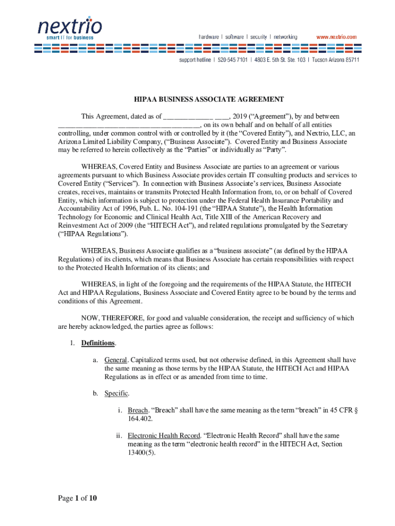 HIPAA BUSINESS ASSOCIATE AGREEMENT This Agreement, dated as of ___ ___, 2019 (Agreement), by and between ___, on its own behalf and on behalf of all entities controlling, under common control with
