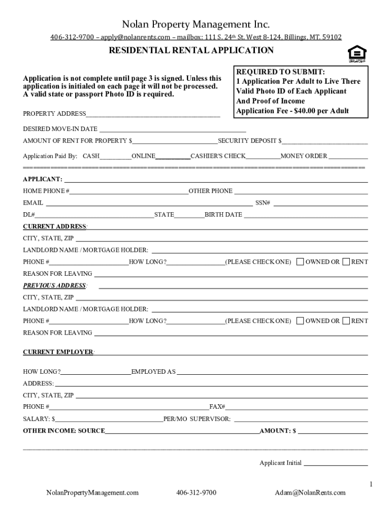 Nolan Property Management Inc. 4063129700 apply@nolanrents.com mailbox: 111 S. 24th St. West 8124, Billings, MT. 59102RESIDENTIAL RENTAL APPLICATIONREQUIRED TO SUBMIT: 1 Application Per Adult to Live