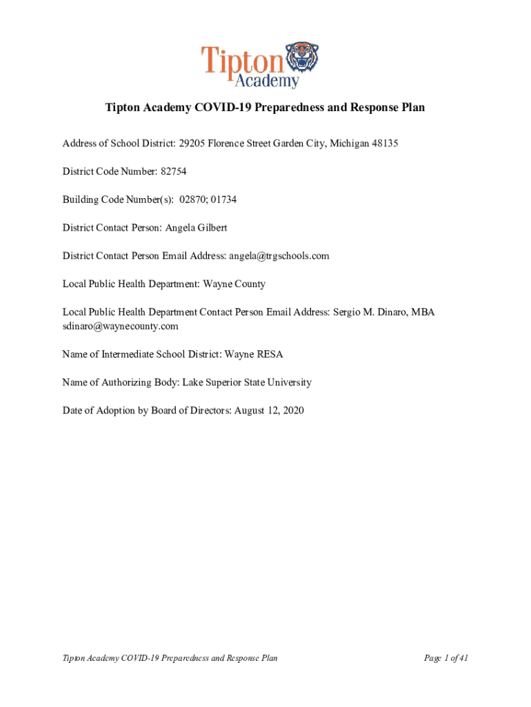 Tipton Academy COVID19 Preparedness and Response Plan Address of School District: 29205 Florence Street Garden City, Michigan 48135 District Code Number: 82754 Building Code Number(s): 02870; 01734