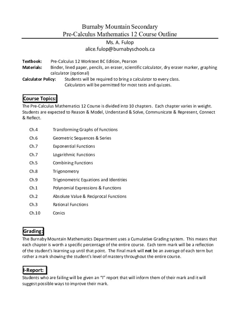 Burnaby Mountain Secondary PreCalculus Mathematics 12 Course Outline Ms. A. Fulop alice.fulop@burnabyschools.ca Textbook: Materials:PreCalculus 12 Worktext BC Edition, Pearson Binder, lined paper,