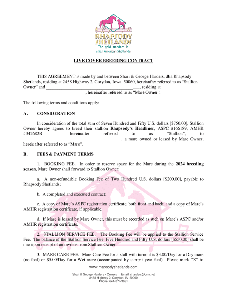 LIVE COVER BREEDING CONTRACTS AGREEMENT is made by and between Shari & George Harder, DBA Rhapsody