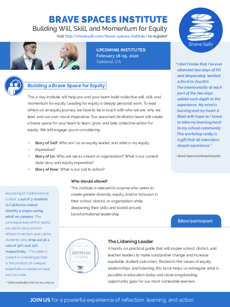 BRAVE SPACES INSTITUTEBuilding Will, Skill, and Momentum for Equity Visit http://shanesafir.com/bravespacesinstitute/ to register!UPCOMING INSTITUTES: February 1819, 2020 Oakland, CABuilding a Brave