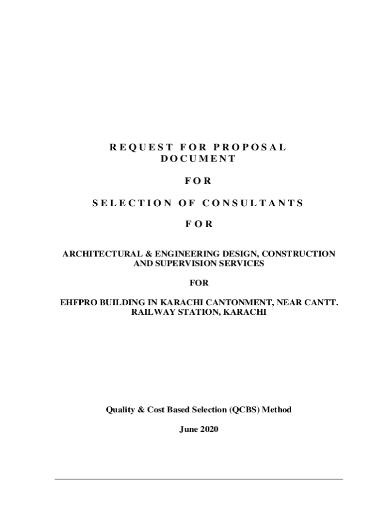 REQUEST FOR PROPOSAL DOCUMENT FOR SELECTION OF CONSULTANTS FOR ARCHITECTURAL & ENGINEERING DESIGN, CONSTRUCTION AND SUPERVISION SERVICES FOR EHFPRO BUILDING IN KARACHI CANTONMENT, NEAR CANTT. RAILWAY
