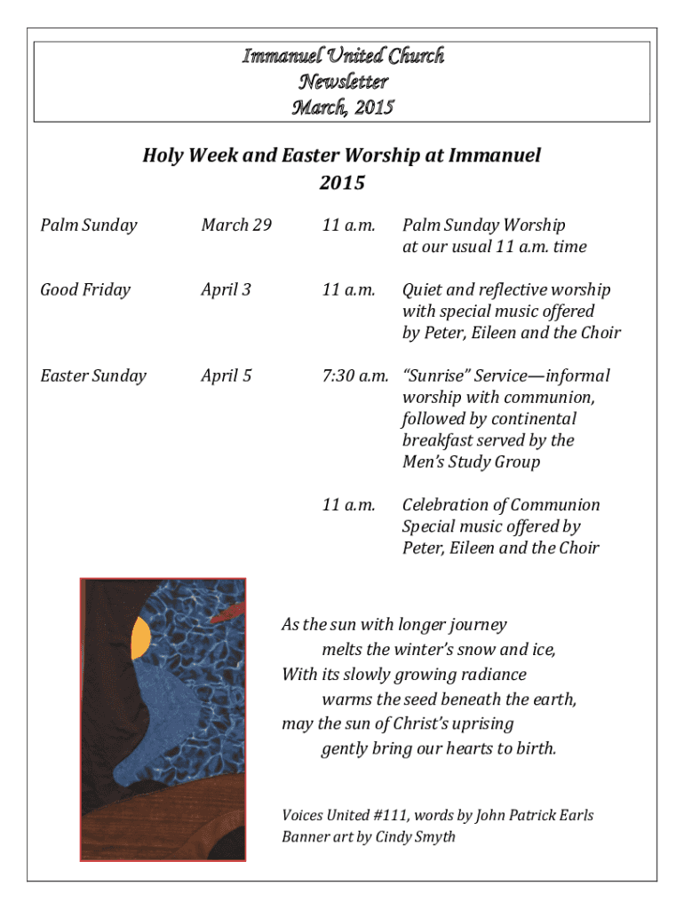 Immanuel United Church Newsletter March, 2015 Holy Week and Easter Worship at Immanuel 2015 Palm SundayMarch 2911 a.m.Palm Sunday Worship at our usual 11 a.m. timeGood FridayApril 311 a.m.Quiet and