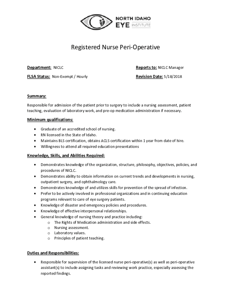 Registered Nurse PeriOperative Department: NICLCReports to: NICLC ManagerFLSA Status: NonExempt / HourlyRevision Date: 5/18/2018Summary: Responsible for admission of the patient prior to surgery to