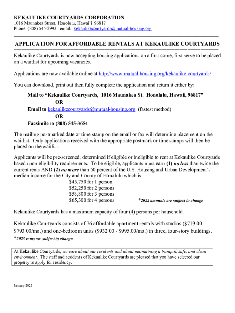 KEKAULIKE COURTYARDS CORPORATION 1016 Maunakea Street, Honolulu, Hawaii 96817 Phone: (808) 5452993 email: kekaulikecourtyards@mutualhousing.org ___APPLICATION FOR AFFORDABLE RENTALS AT KEKAULIKE COURTYARDS