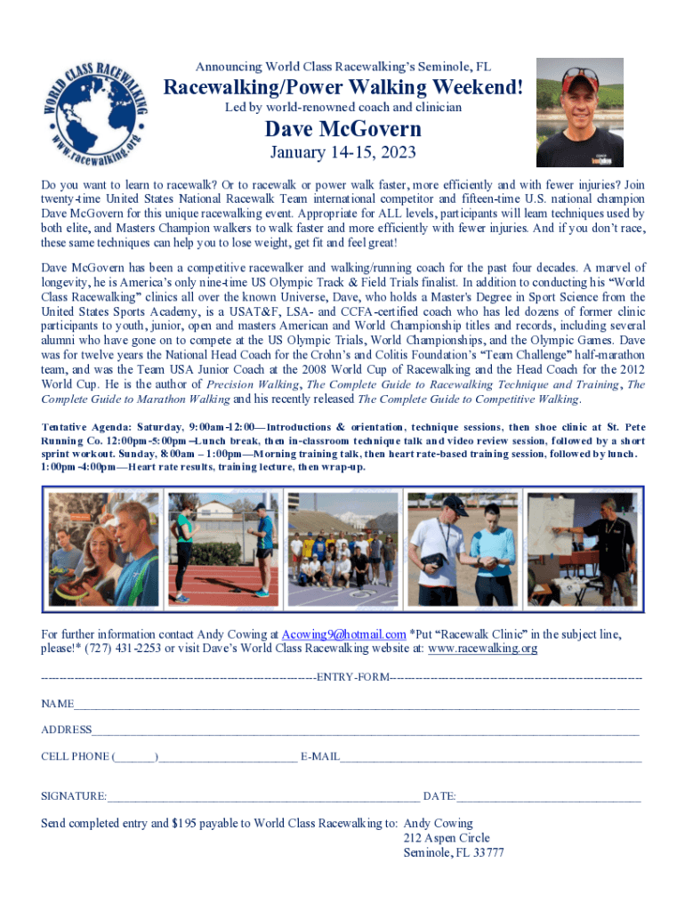 Announcing World Class Racewalkings Seminole, FLRacewalking/Power Walking Weekend! Led by worldrenowned coach and clinicianDave McGovern January 1415, 2023 Do you want to learn to racewalk? Or to