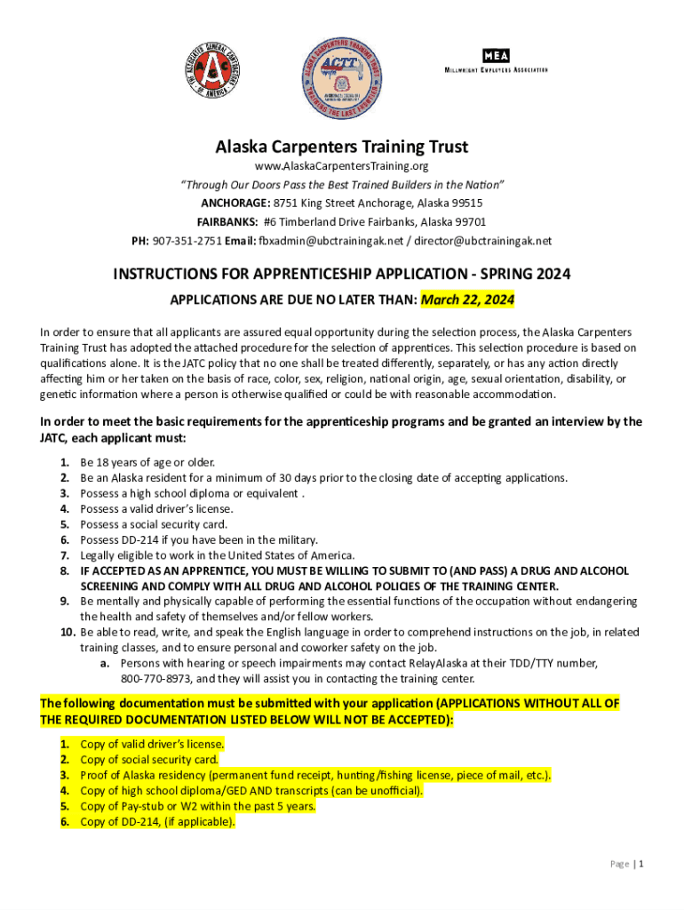 Alaska Carpenters Training Trust ww.AlaskaCarpentersTraining.org w Through Our Doors Pass the Best Trained Builders in the Nation ANCHORAGE:8751 King Street Anchorage, Alaska 99515 FAIRBANKS: #6 Timberland