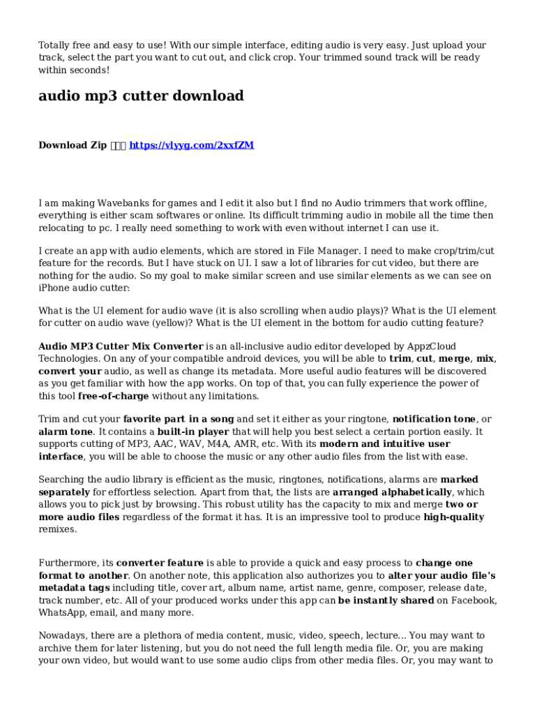 Audio MP3 cutter download refers to software or applications that allow users to cut, trim, or edit MP3 audio files. Users can download these tools to create audio clips for various purposes such as ringtones or personalized music edits.
