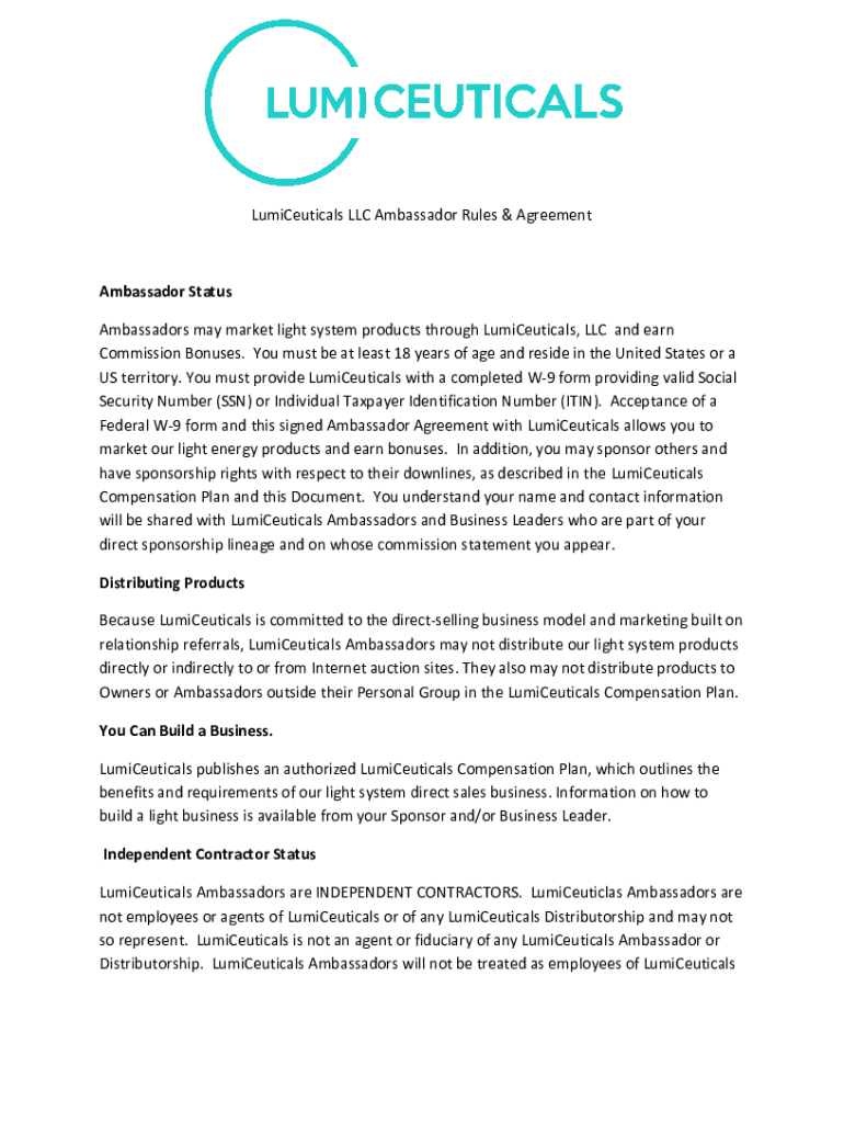 LumiCeuticals LLC Ambassador Rules & AgreementAmbassador Status