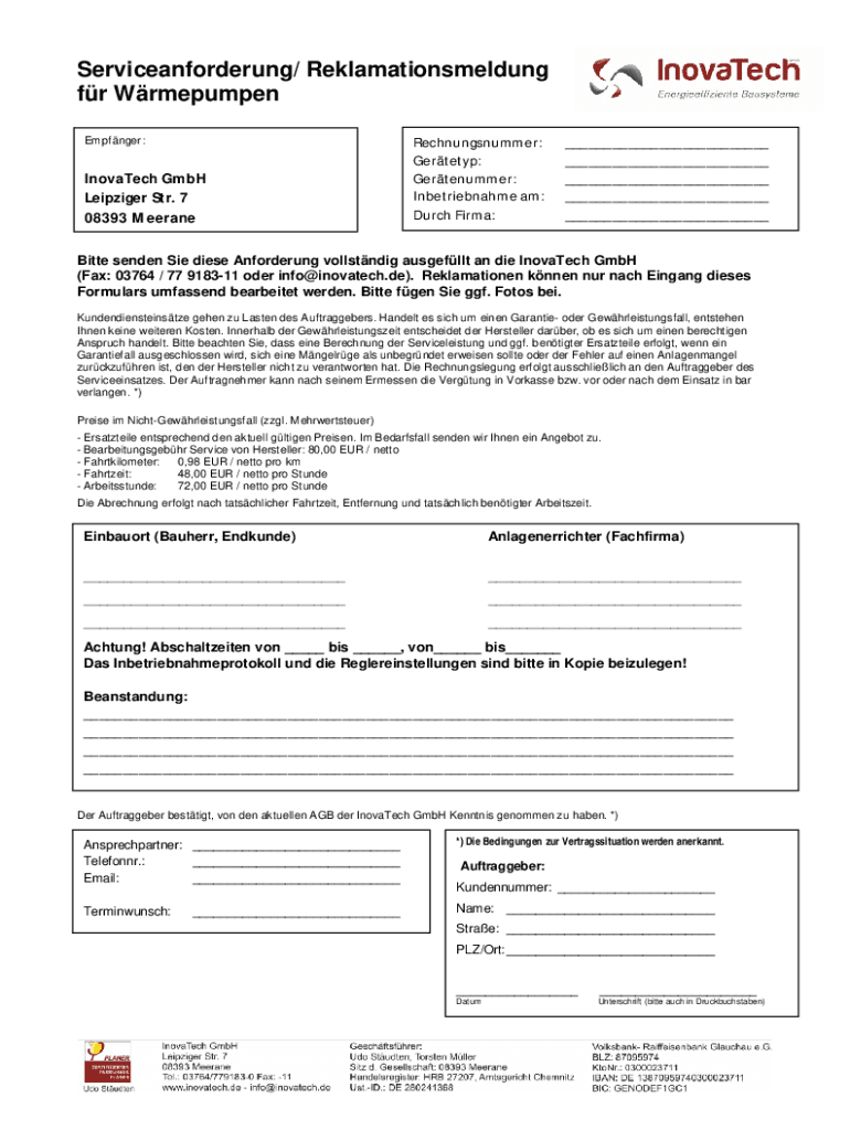 Serviceanforderung/ Reklamationsmeldung fr Wrmepumpen Empfnger:InovaTech GmbH Leipziger Str. 7 08393 MeeraneRechnungsnummer: Gertetyp: Gertenummer: Inbetriebnahme am: Durch Firma:___ ___ ___ ___ ___Bitte