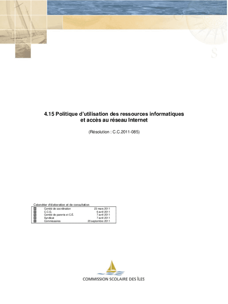 4.15 Politique dutilisation des ressources informatiques et accs au rseau Internet (Rsolution : C.C.2011085)Calendrier dlaboration et de consultation Comit de coordination C.C.G. Comit de parents