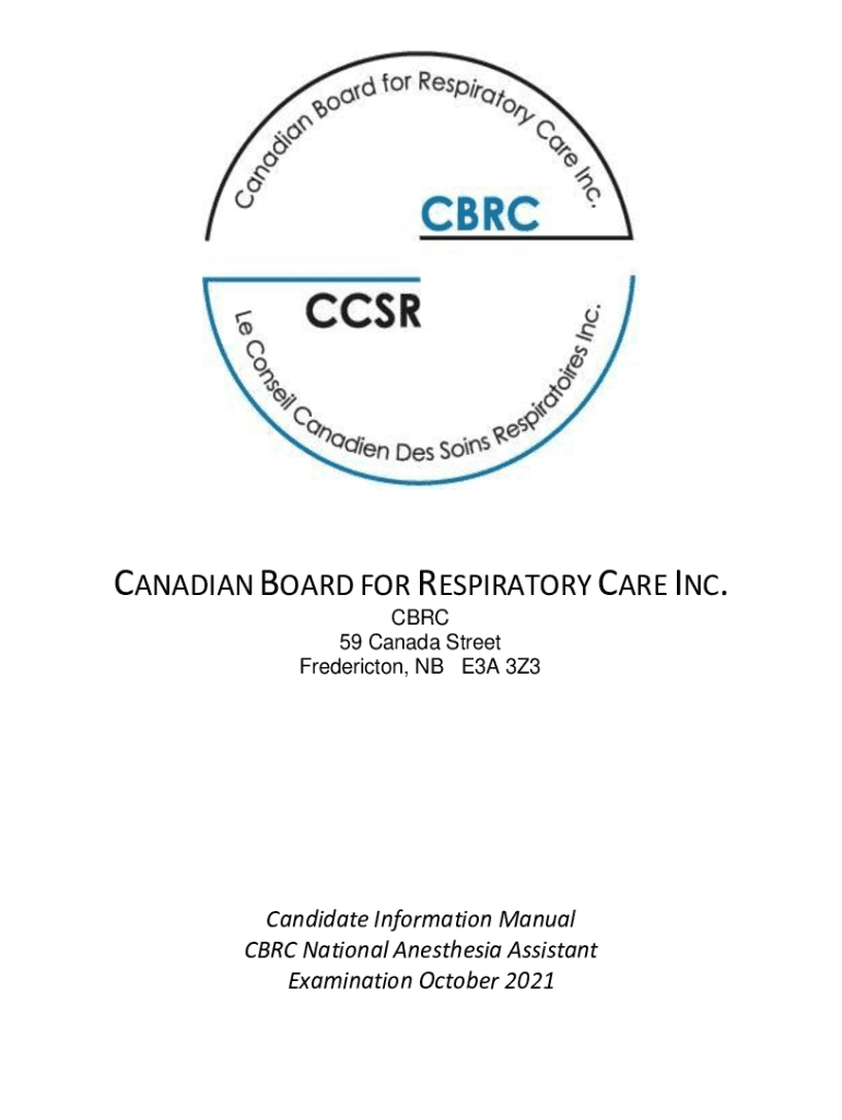 CANADIAN BOARD FOR RESPIRATORY CARE INC. CBRC 59 Canada Street Fredericton, NB E3A 3Z3Candidate Information Manual CBRC National Anesthesia Assistant Examination October 2021Board of Directors Meena