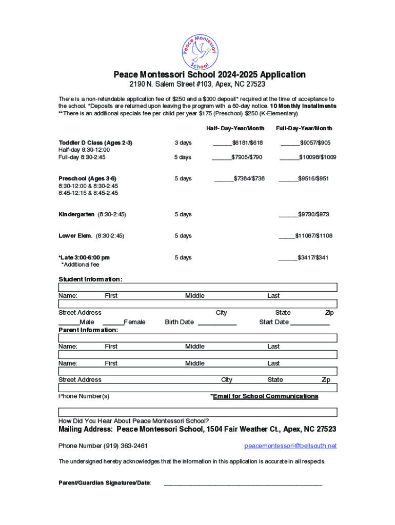 Peace Montessori School 20242025 Application 2190 N. Salem Street #103, Apex, NC 27523 There is a nonrefundable application fee of $250 and a $300 deposit* required at the time of acceptance to the