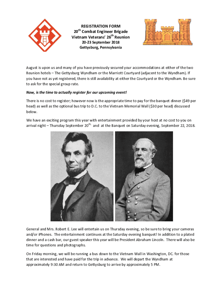 REGISTRATION FORM 20th Combat Engineer Brigade Vietnam Veterans 26th Reunion 2023 September 2018 Gettysburg, PennsylvaniaAugust is upon us and many of you have previously secured your accommodations