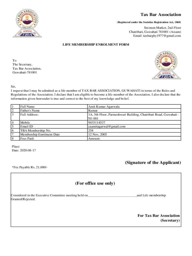 Tax Bar Association (Registered under the Societies Registration Act, 1860)Sreeram Market, 2nd Floor Chatribari, Guwahati 781001 (Assam) Email: taxbarghy1977@gmail.com LIFE MEMBERSHIP ENROLMENT FORMTo