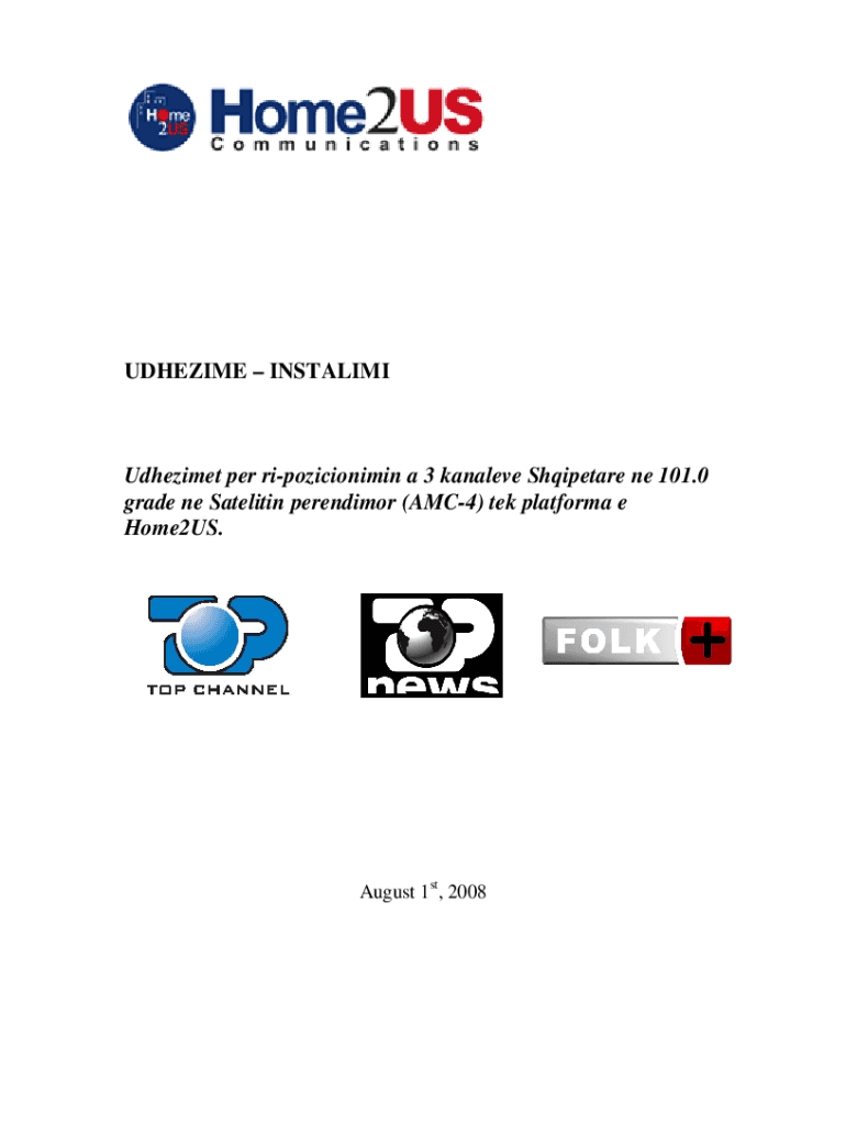 UDHEZIME INSTALIMIUdhezimet per ripozicionimin a 3 kanaleve Shqipetare ne 101.0 grade ne Satelitin perendimor (AMC4) tek platforma e Home2US.August 1st, 20081. Udhezime Tashme, Top Channel transmeton
