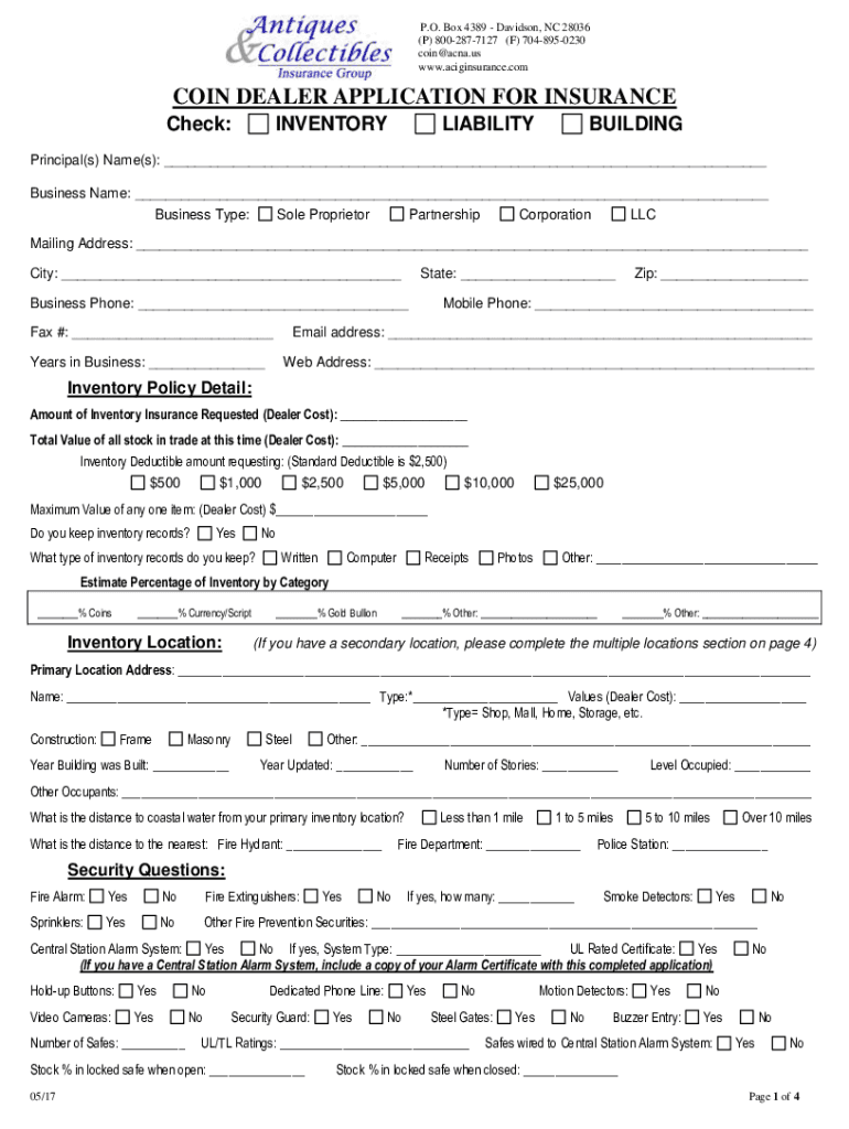 P.O. Box 4389 Davidson, NC 28036 (P) 8002877127 (F) 7048950230 coin@acna.us www.aciginsurance.comCOIN DEALER APPLICATION FOR INSURANCE Check:INVENTORYLIABILITYBUILDINGPrincipal(s) Name(s): ___ Business