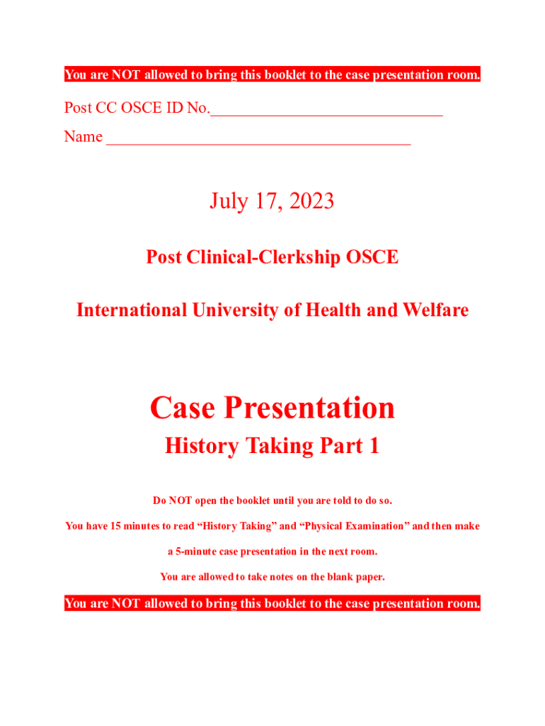 You are NOT allowed to bring this booklet to the case presentation room.Post CC OSCE ID No.___ Name ___July 17, 2023 Post ClinicalClerkship OSCE International University of Health and WelfareCase