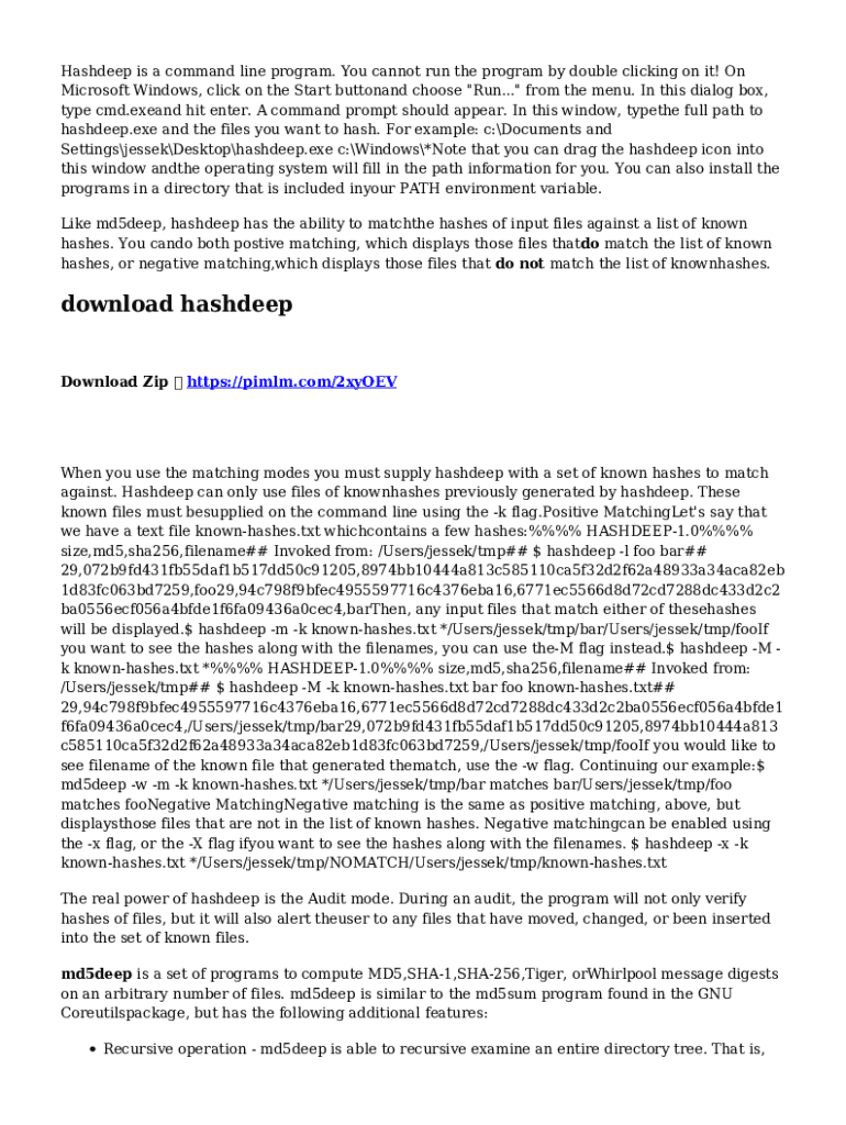 Hashdeep is a command line program. You cannot run the program by double clicking on it! On Microsoft Windows, click on the Start buttonand choose \"Run...\" from the menu. In this dialog box, type